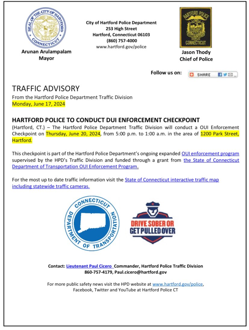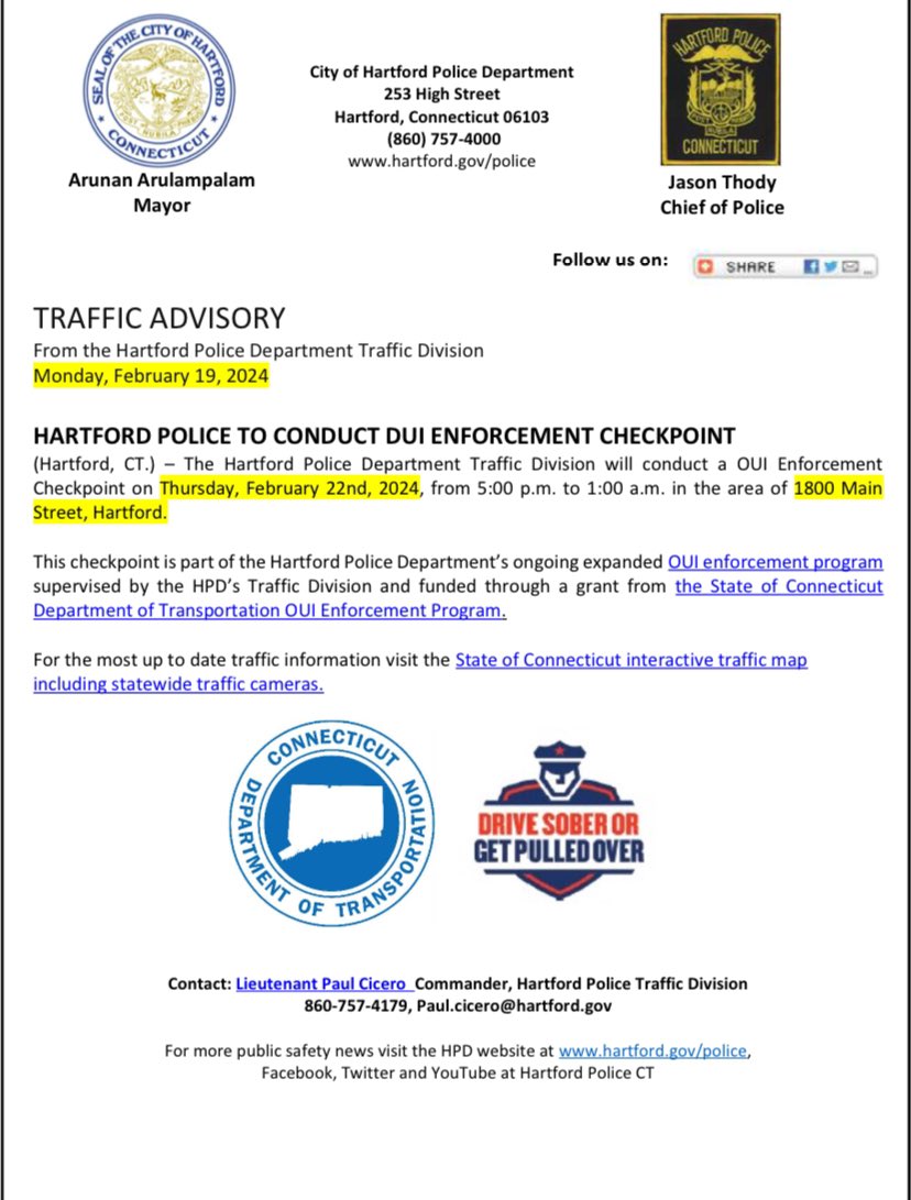 Hartford Police CT on X: “🚨 Please see attached OUI checkpoint