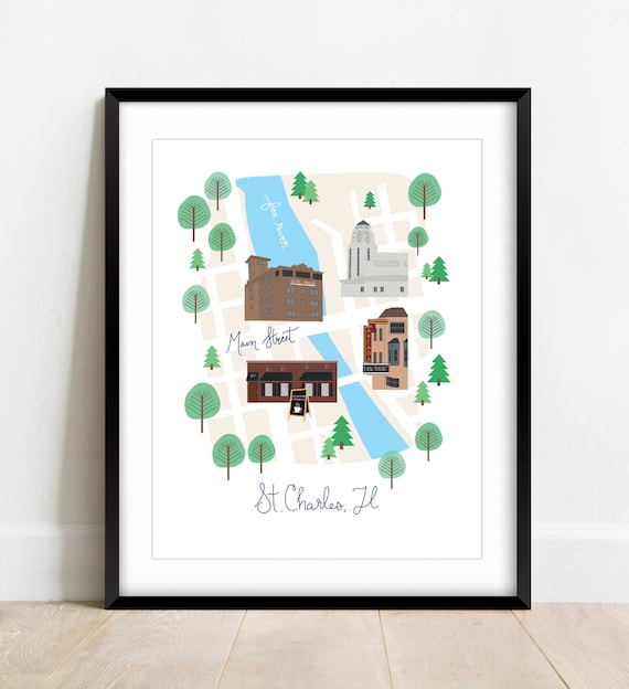 Hand Drawn City Map of Downtown St. Charles Illinois Historic Main